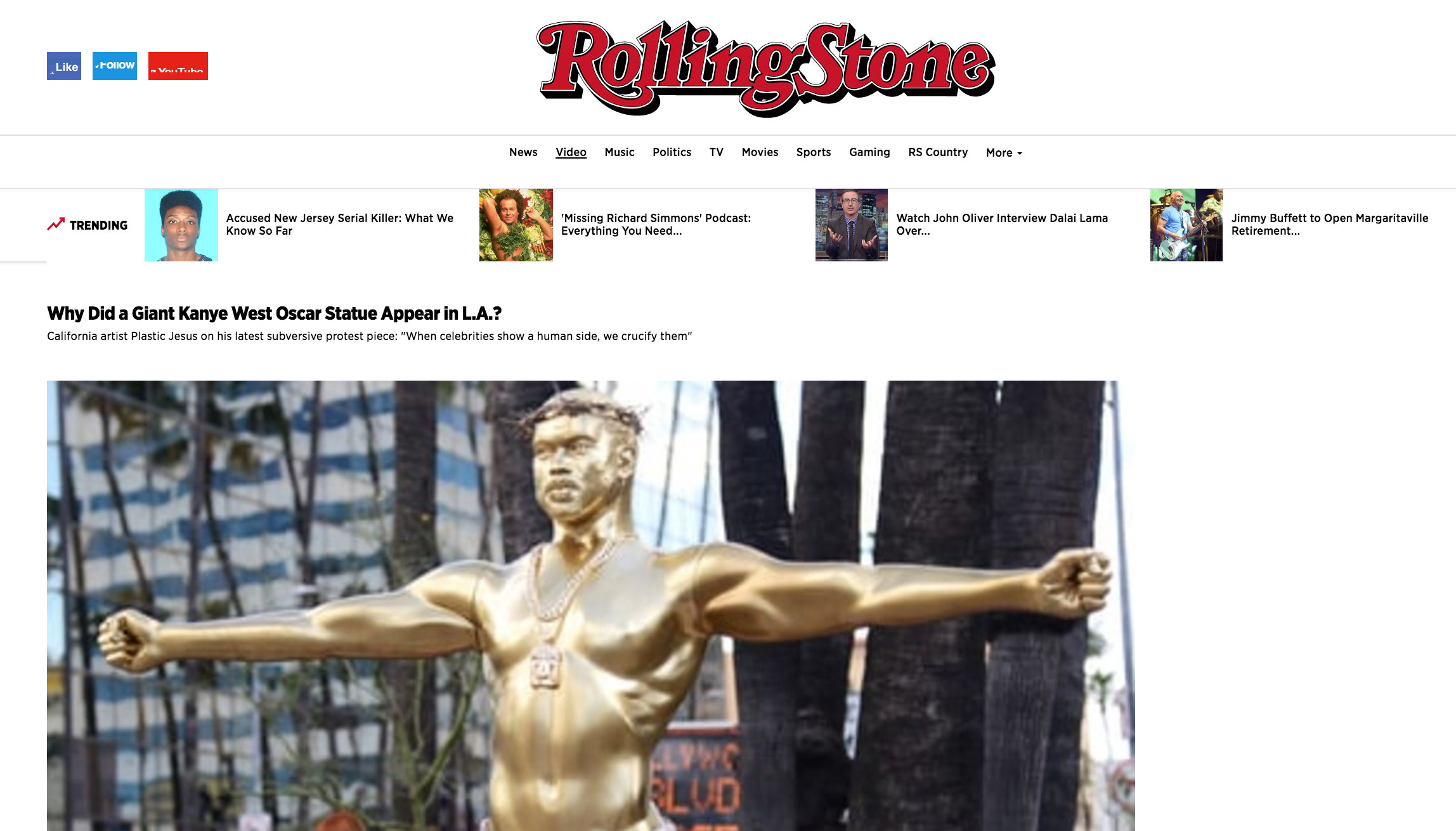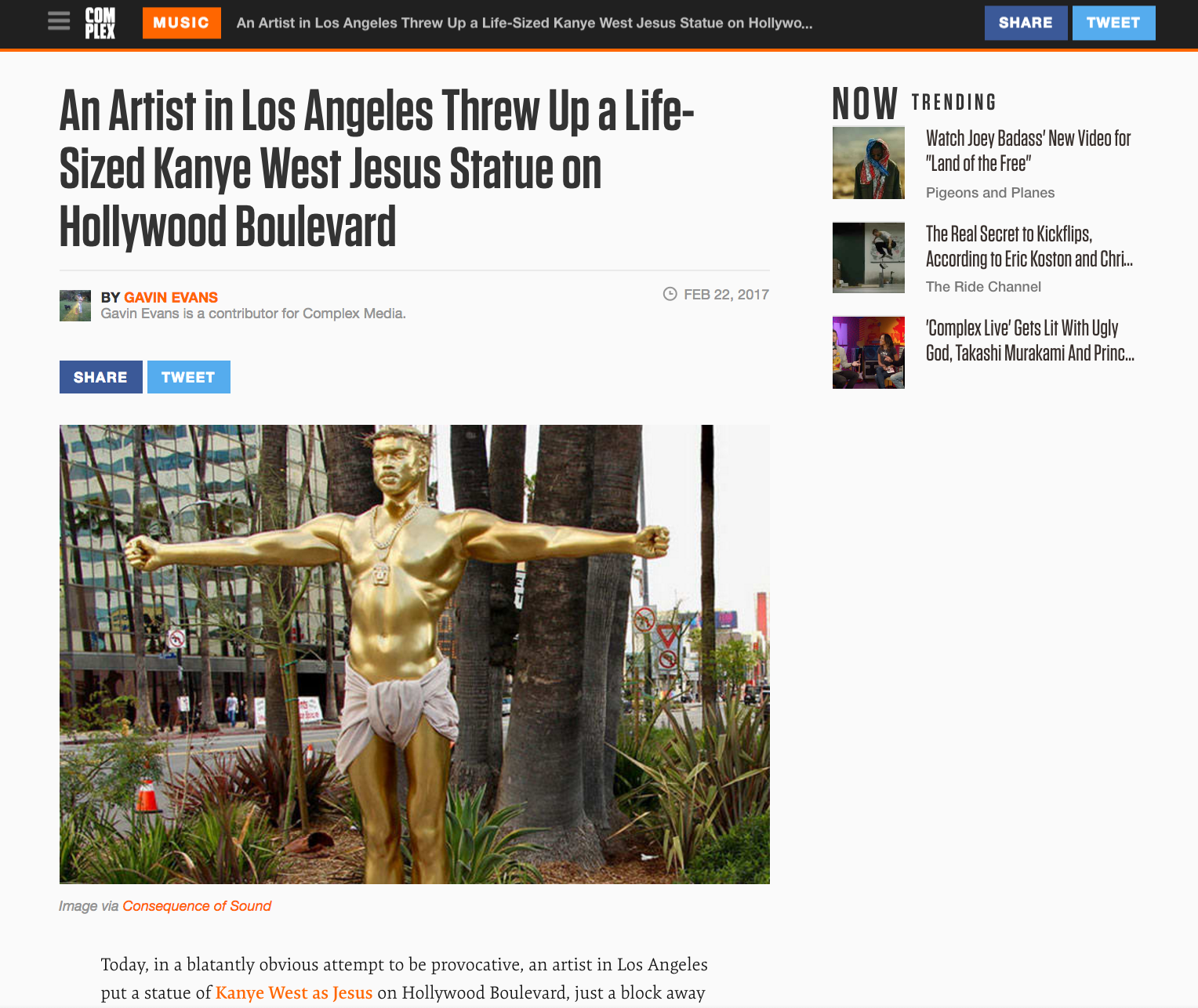 An Artist in Los Angeles Threw Up a Life-Sized Kanye West Jesus Statue on Hollywood Boulevard Plastic JesusMarch 7, 2017Comment