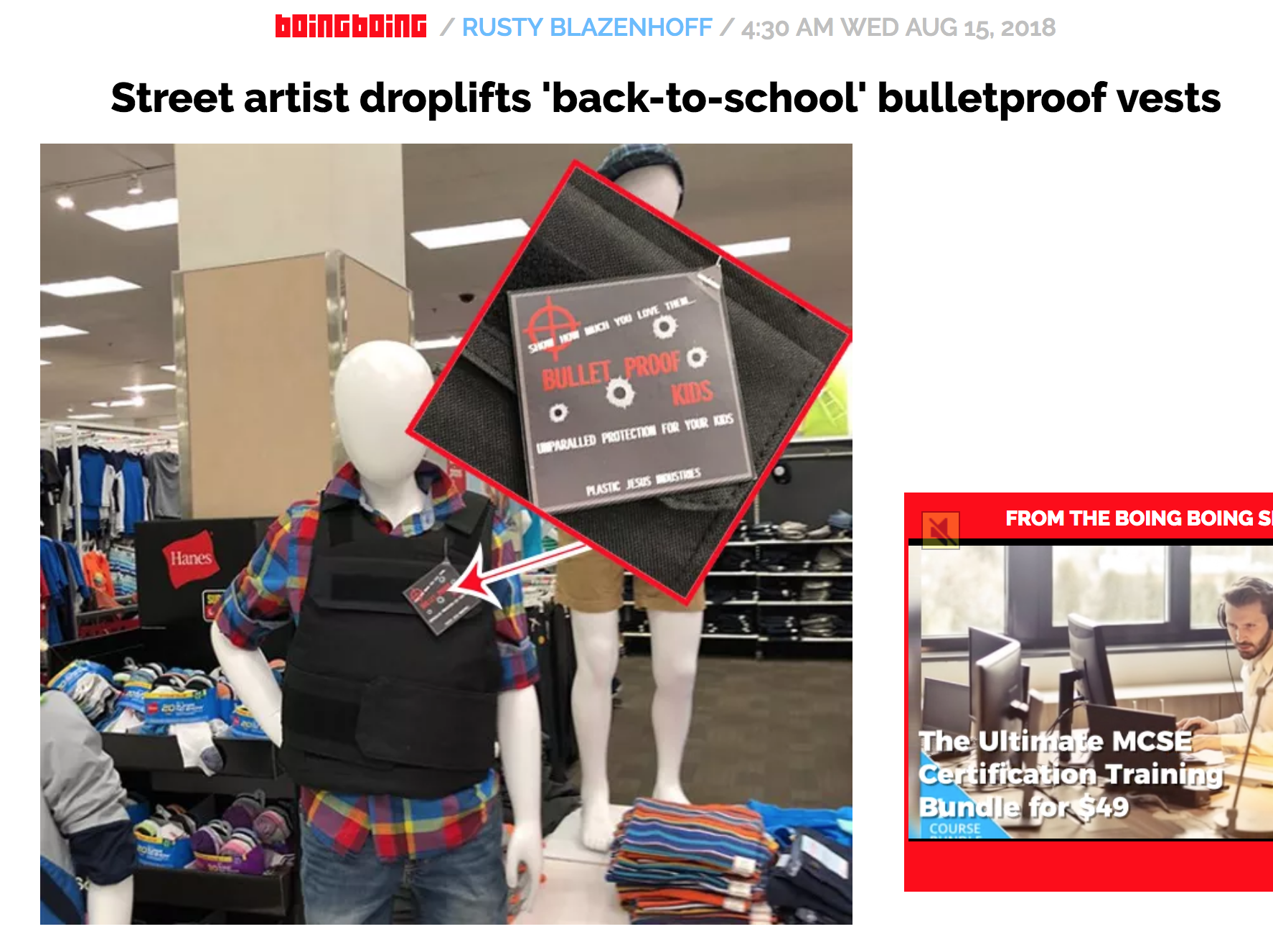 Artist Infiltrates Back-to-School Shopping Displays with Bulletproof Vests Plastic JesusSeptember 4, 2018Comment